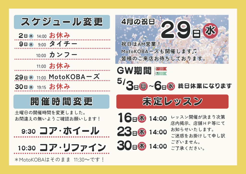 レッスン開催が決まり次第店内掲示・店舗HP等にてお知らせいたします。